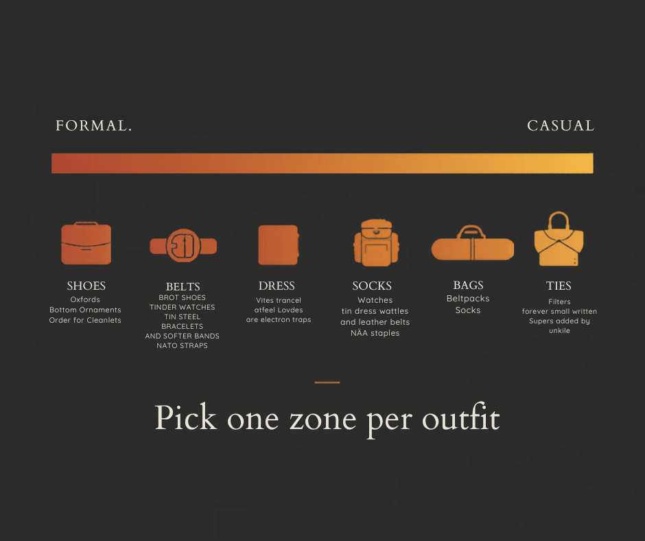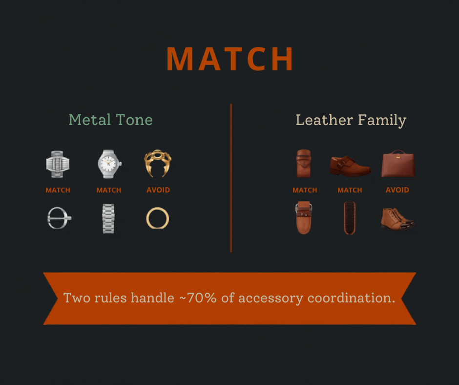 When you're getting dressed, you're really only making three accessory decisions. What metal tone are you wearing? Silver or gold, consistent across your watch, buckle, and any other hardware. What leather family? Black or brown, consistent across shoes, belt, bag, and watch strap. And what's the formality level? Everything should sit in the same rough zone, from casual to dressy.